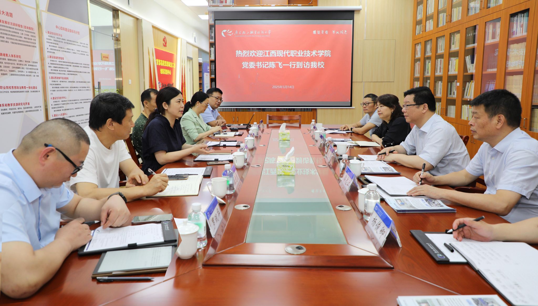 5月14日,江西现代职业技术学院党委书记陈飞一行5人到访我校,党委副书记梁艳珍在新港校区接待了到访客人。梁艳珍对江西现代职业技术学院一行的到访表示热烈欢迎,并陪同参观了国际数字创意谷、思创中心等场地,随后双方在第二实训楼一楼举行座谈会。梁艳珍简要介绍了学校基本情况,以及党建思政、产…