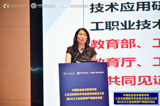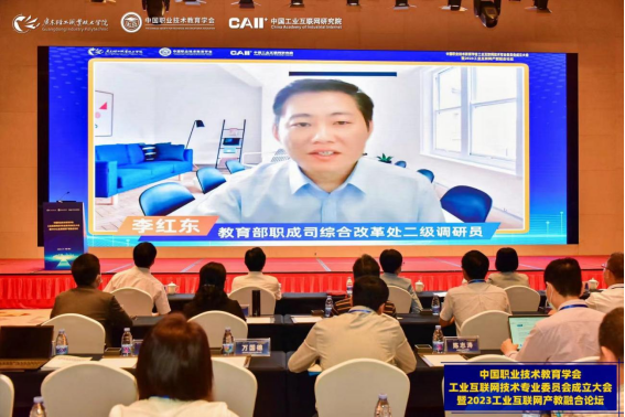 教育部职成教司综合改革处二级调研员李红东线上出席会议并致辞,他表示,中国职教学会主动适应产业发展需求和人才培养需要,组建工业互联网技术专业委员会,积极探索工业互联网领域的产教融合、科教融汇,促进教育链人才链与产业链、创新链的有机衔接,体现了中国职教学会高度的时代自觉和责任担当,并对工业互联网技术专委会建设提出指导性要求和建议。