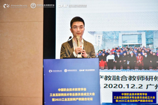 航天云网数据研究院(广东)有限公司产教融合负责人余庆鑫做了题为《工业互联网产教融合探索》的主题报告,分享了航天云网在工业互联网人才培养以及工业互联网产教融合方面,对“岗、课、师、训、赛、证”六位一体的工业互联网人才培养的思路和人才培养的体系,以及在培训教材、认证体系、实训体系、共建产业学院等方面的探索和实践。