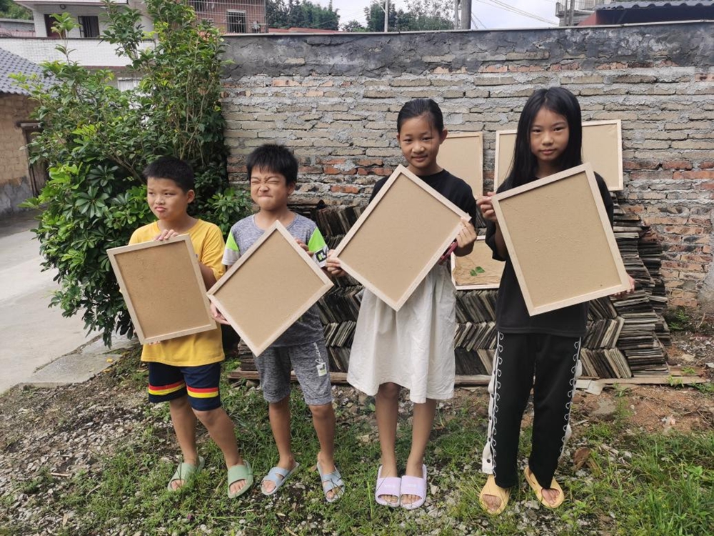 当地村民路国忠是流溪纸技艺的传承人,他带领实践队体验古法造纸的技艺。“自己一直记得小时候爷爷造纸的场景,如今看到流溪纸正在被一步一步地救活,年轻人愿意来传承这门手艺,真的感到十分欣慰。”路国忠说。