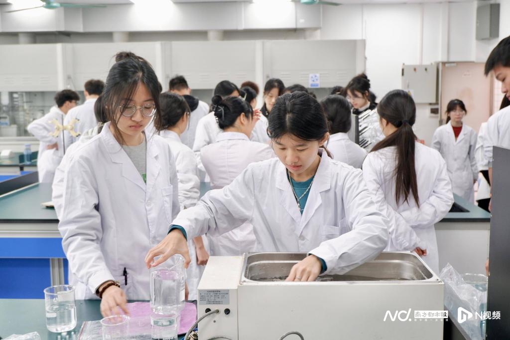 制浆造纸工艺实训室中,学生们三两一组,学习制浆实操。