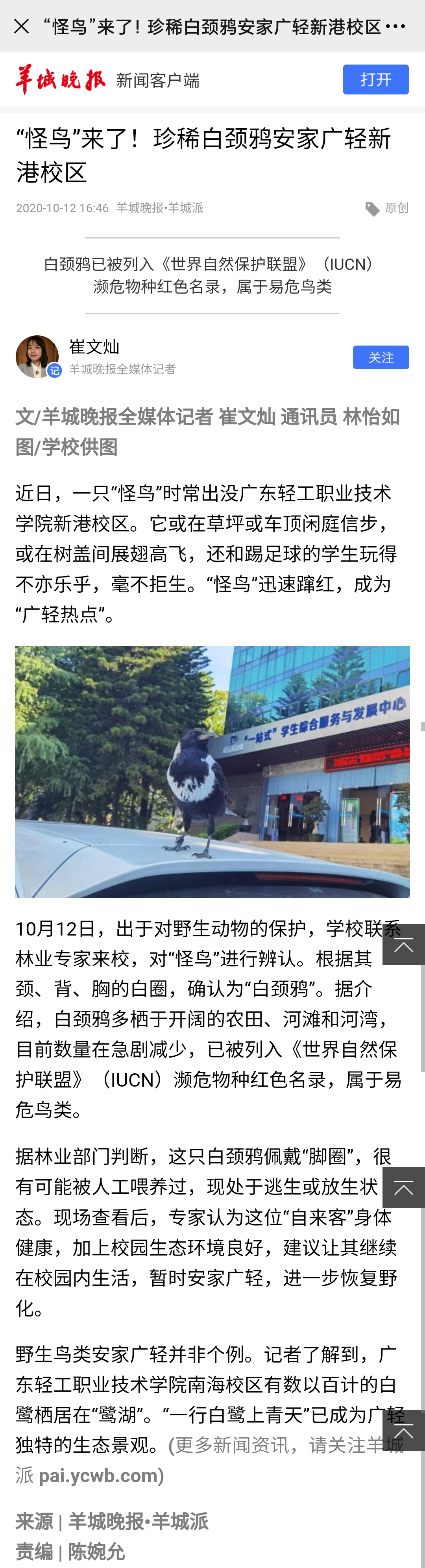 羊城晚报:“怪鸟”来了!珍稀白颈鸦安家广轻新港校区
