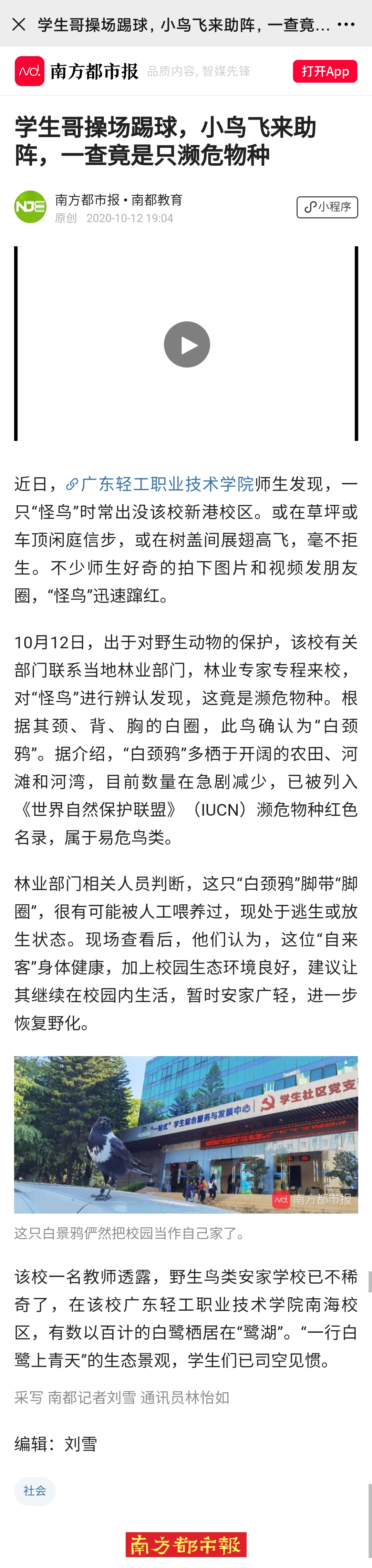 南方都市报:学生哥操场踢球,小鸟飞来助阵,一查竟是只濒危物种