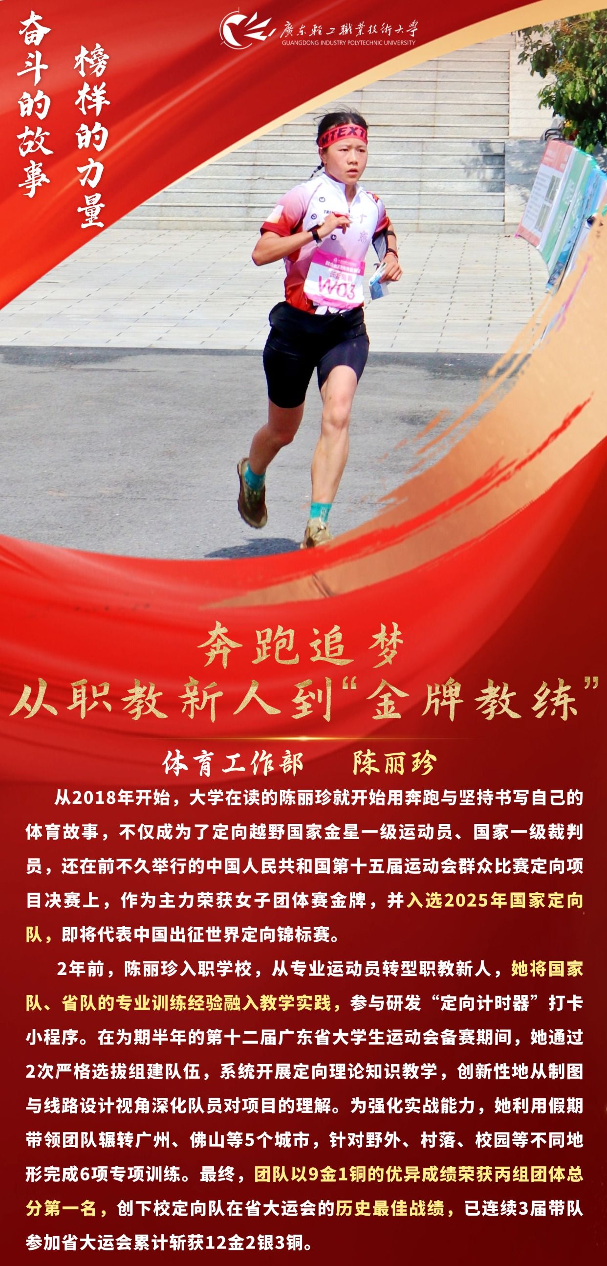 从2018年开始,大学在读的陈丽珍就开始用奔跑与坚持书写自己的体育故事,不仅成为了定向越野国家金星一级运动员、国家一级裁判员,还在前不久举行的中国人民共和国第十五届运动会群众比赛定向项目决赛上,作为主力荣获女子团体赛金牌,并入选2025年国家定向队,即将代表中国出征世界定向锦标赛。