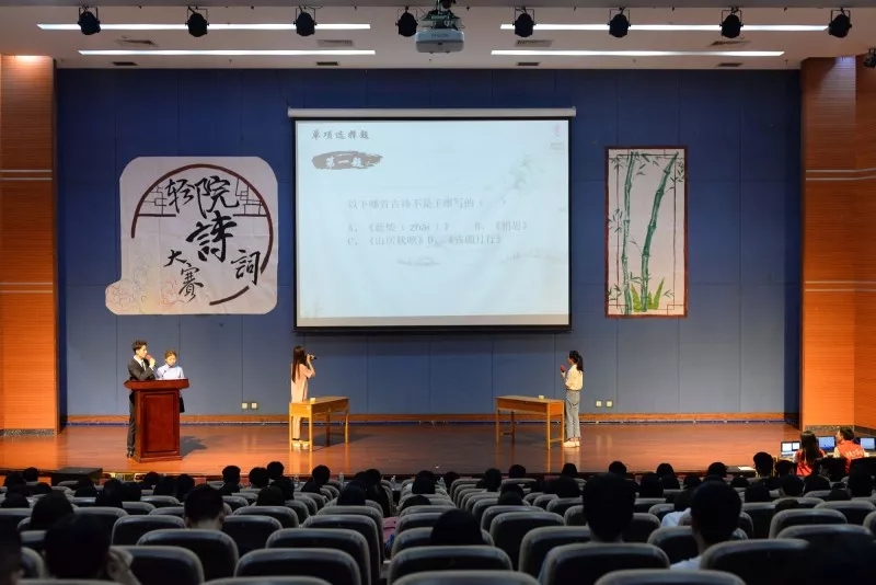 为了引导年轻人畅吟和倾听诗词,诵中华精髓,造诗香轻院,我校举办了轻院诗词大赛。韶光寄书茶,诗酒趁年华,这是一场集结了四百多位诗词爱好者的诗词盛典。本次诗词大赛以诗会友,共分三个阶段,初赛通过笔试考察选手古诗词文化水平,复赛则是在图书馆报告厅进行“一站到底”现场比赛,采用积分赛模式,决赛一共分 “百人团大战”、 “飞花令”和 “冠军争夺战”三个环节。