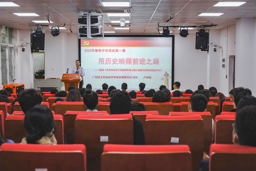 3月23日上午,在广州新港校区第一实训楼105教室,学校党委副书记、校长卢坤建以“用历史映照前进之路——解读《中共中央关于党的百年奋斗重大成就和历史经验的决议》”为主题,为我校餐饮201、社工201班同学主讲了2022年春季学期“思政第一课”。