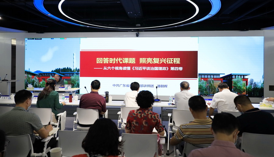 10月14日,学校举办党委理论中心组(扩大)学习会、《习近平谈治国理政》第四卷专题辅导报告会。广东省委宣传部讲师团副团长潘朝晖应邀来校作宣讲报告。全体校领导、副科级(含)以上干部参加现场学习,广大师生党员通过线上方式聆听宣讲。党委副书记梁艳珍主持报告会。