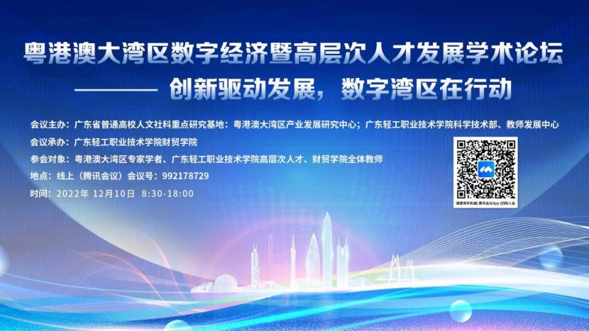 2022年12月10日,“粤港澳大湾区数字经济暨高层次人才发展——创新驱动发展,数字湾区在行动”的学术论坛在线上举办。论坛由我校粤港澳大湾区产业发展研究中心(广东省普通高校人文社科重点研究基地),科学技术部、教师发展中心联合主办,由财贸学院承办。论坛邀请了多名高校专家和企业高层代表出席并作主题报告。