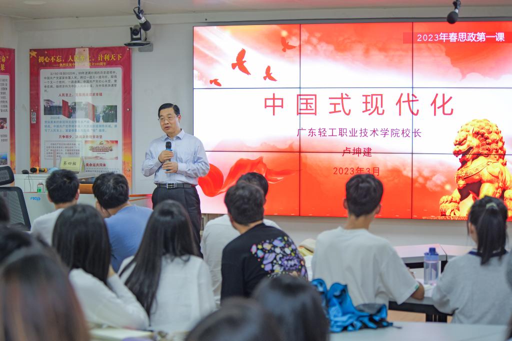 3月9日下午,学校校长卢坤建围绕“中国式现代化”主题在南海北校区研练中心为计算机211、212班的同学讲了2023年春季学期“思政第一课”。