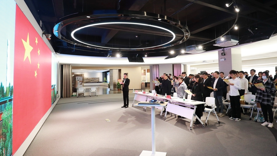 随后进行了2023年新教师宣誓仪式,李荣宣读了61位新入职教师名单。在艺术设计学院叶军老师的领誓下,61名新入职教师面对国旗庄严宣誓,立志成为“有理想信念、有道德情操、有扎实知识、有仁爱之心”的“四有”好教师,为教育发展、国家繁荣和民族振兴努力奋斗。