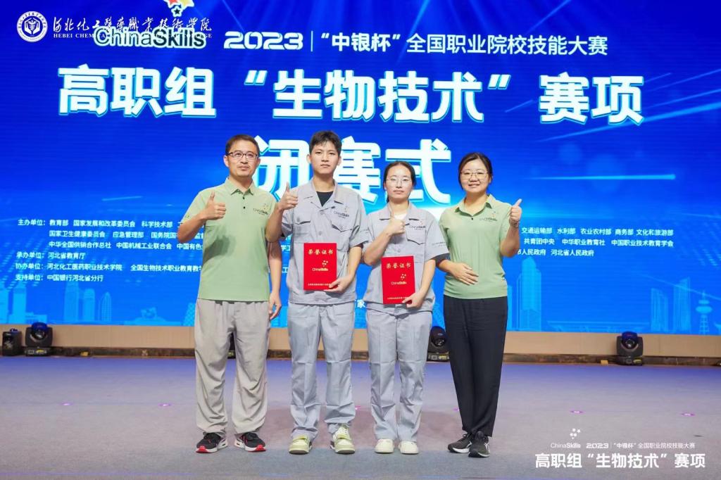 8月25日至27日,2023年“中银杯”全国职业院校技能大赛(高职组)“生物技术”赛项在河北举办。食品与生物技术学院生物制药技术专业教师朱晓立、张媛媛指导的生化211班叶明浩、生药211班方婉婷同学荣获团体二等奖。