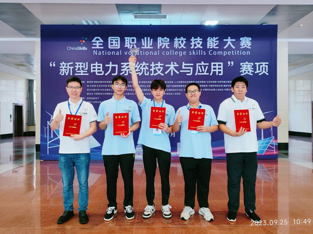 9月22日至25日,全国职业院校技能大赛(高职组)新型电力系统技术与应用赛项在陕西举行,来自全国32个省份共58支队伍参赛。我校机电技术学院3位同学,电气214班樊耀华、电气221班黄有烽、电气221班罗锡杰组成团队首次参加该赛项,经过激烈比拼,最终荣获国赛一等奖,这是我校学子首次在该赛项上获奖,也是我校在持续深化“三教”改革,扎实推进“岗课赛证”融通综合育人工作中取得的显著成效。本次参赛队伍由机电技术学院院长张友能领队,廖昌明、黄鹏担任指导老师。