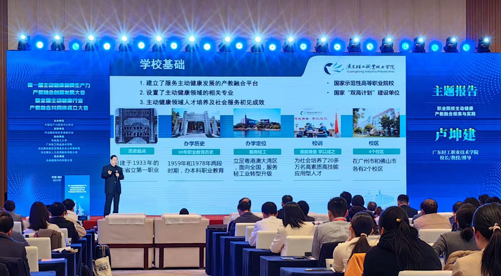 全国主动健康行业产教融合共同体是在教育部职业与成人教育司、中国生产力促进中心协会指导下,由主动健康科技有限公司、华南理工大学、广东轻工职业技术学院牵头,联合本科高校、职业院校、科研院所、相关行业协会、企业等单位共同组建。广东轻工职业技术学院、华南理工大学、主动健康科技有限公司担任首届理事会轮值理事长单位,华南理工大学担任共同体秘书长单位。共同体首批成员单位有251家,覆盖27个省、自治区、直辖市。卢坤建在会上作《主动健康产教融合的广轻探索与实践》主题报告。