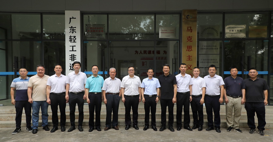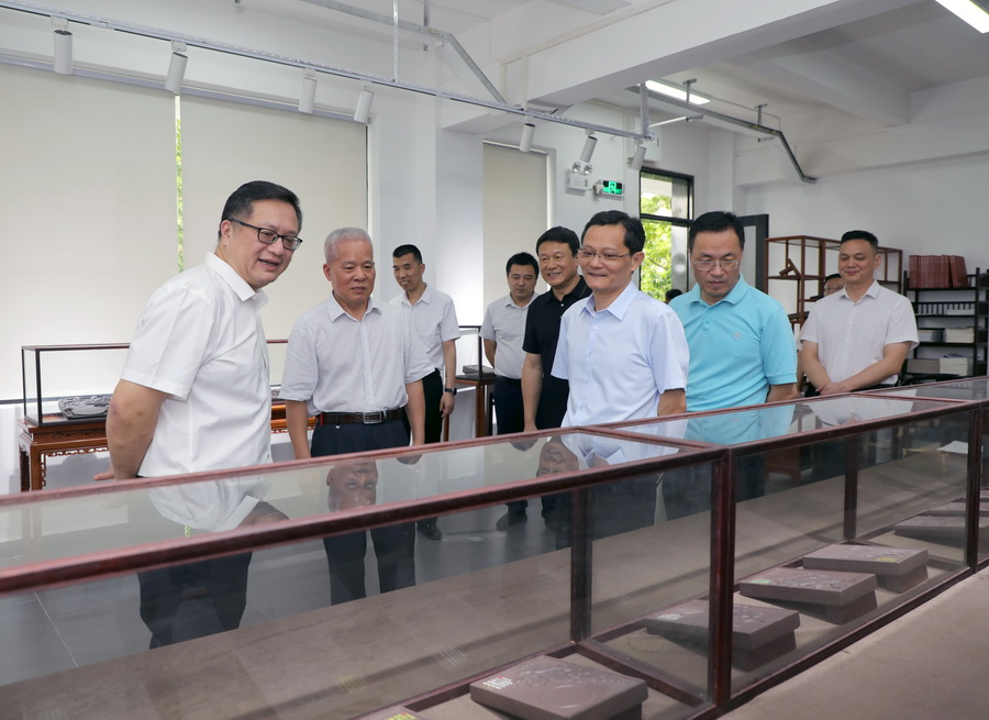 4月17日,荔湾区委副书记、组织部部长黄洪飙,广东省人民政府文史研究馆馆员、文化遗产研究院院长、中国石雕艺术大师张春雷等一行到我校新港校区,深入“广东轻工非遗学院”,就非遗建设工作开展调研。学校党委书记杜安国接待,并一同参观了“国际数字创意谷”技术技能平台和广东轻工非遗学院端砚传习基地,随后双方在多功能展示中心会议室进行了座谈交流。