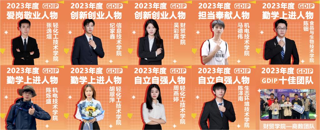 活动现场通过视频展播、海报展示的方式,集中展示了广轻优秀学子在自立自强、爱岗敬业、勤学上进、文艺体育、担当奉献、创新创业等方面的典型事迹。“自立自强人物”陈泽南,身兼三职,担任广东轻院轻绿环保协会副会长、氢能211班团支书、旅游221班助理班主任,同时还刻苦钻研专业,不断提升综合素质。他2023年度专业课排名第一、综合测评排名第一,还获得国家奖学金和中国大学生自强之星奖学金,以第一发明人申请发明专利3项,实用新型专利1项,发表论文1篇,参加中国国际大学生创新大赛获得国赛银奖、省赛金奖,累计志愿者服务时长157小时并获学校优秀志愿者。“年度十佳团队”商数团队,与时俱进,勇于创新,用数学知识解决现实问题,2023年度获得第十八届“挑战杯“”全国大学生课外学术科技作品竞赛二等奖、第十八届“振兴杯”全国青年职业技能大赛学生组创新创效竞赛全国决赛金奖、“正大杯”第十三届全国大学生市场调查与分析大赛专科组总决赛一等奖、第十七届“挑战杯”广东大学生课外学术科技作品竞赛特等奖1项一等奖1项。优秀学子们靠自己的努力,彰显榜样力量,发挥朋辈示范作用。
