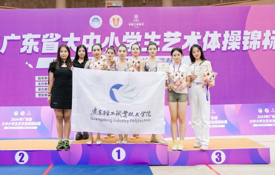 在广东省大中小学生艺术体操锦标赛上,我校8名艺术体操队队员张丹茹(景观231)、梁佳欣(视觉传达223)、梁雄兵(视觉传达223)、谢君瑶(服装231)、叶冰容(跨境电商222)、魏亚茜(工业机器人技术231)、刘晶(艺术设计231)、刘晓曼(艺术设计231),在领队体育工作部副主任陈绿波,教练员周新乐、赵旭恒老师的带领下,取得规定徒手第三名,团体总分第三名。(图文/体育工作部 卢炳坤 赵旭恒 郝卉)