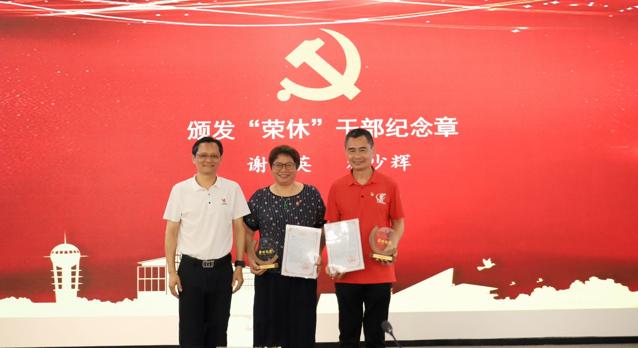 杜安国为参会老党员们颁发“光荣在党50年”纪念章,为“荣休”党员干部代表颁发纪念章,为生活困难党员代表颁发慰问金。