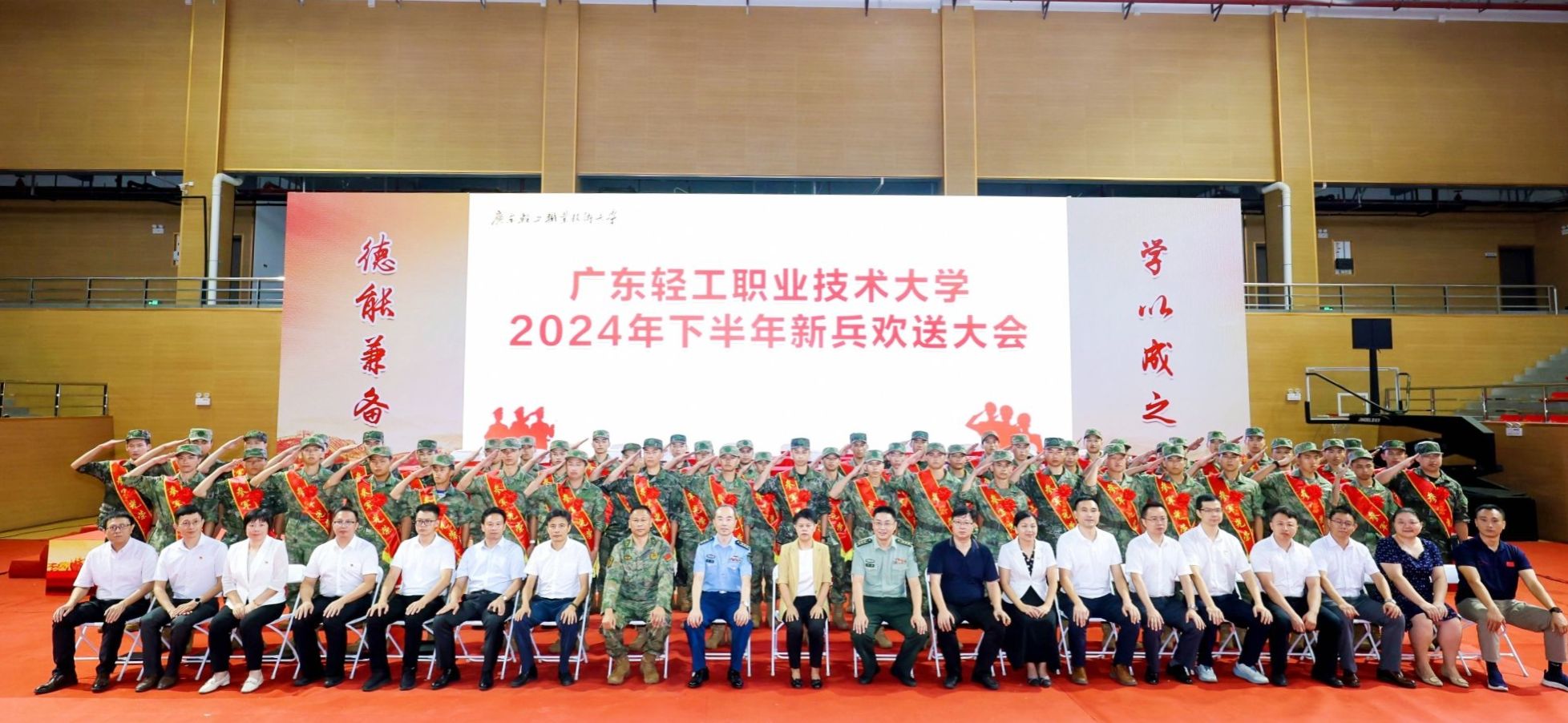 9月14日上午,我校在南海北校区体育馆举行2024年下半年新兵入伍欢送大会,55名我校适龄青年应征入伍。海珠区人民武装部上校政委程钢、南海区人民武装部上校政委胡泊,学校副校长李荣出席欢送大会。
