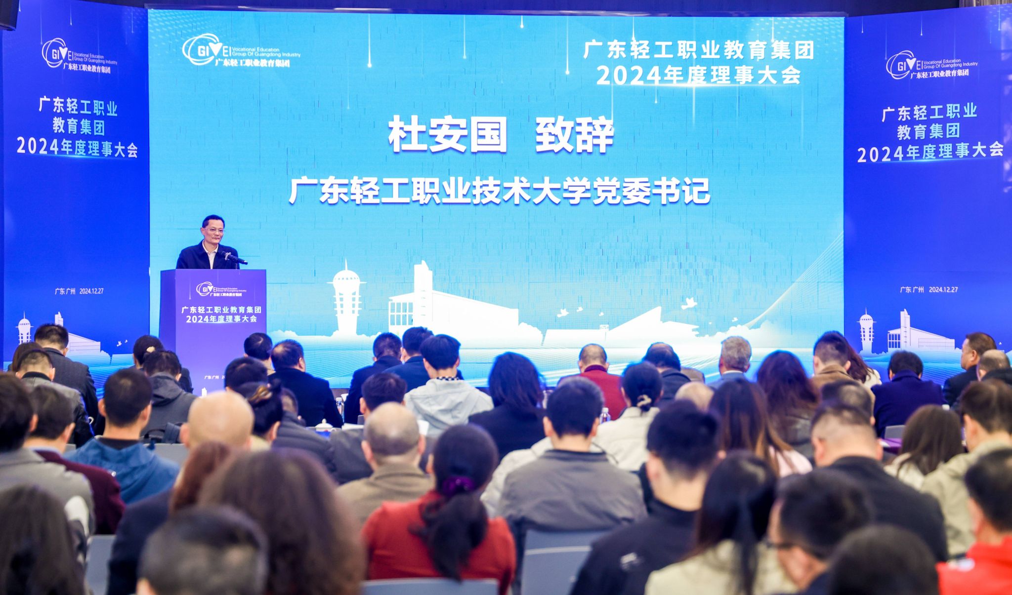12月27日上午,广东轻工职业教育集团2024年度理事大会在学校新港校区商演中心召开,广东省轻工业联合会会长、广东轻工职教集团理事长廖鸣卫,我校党委书记杜安国,我校副校长邓毛程等领导出席会议,共15家院校、百余家企业、超160位成员代表参加会议。