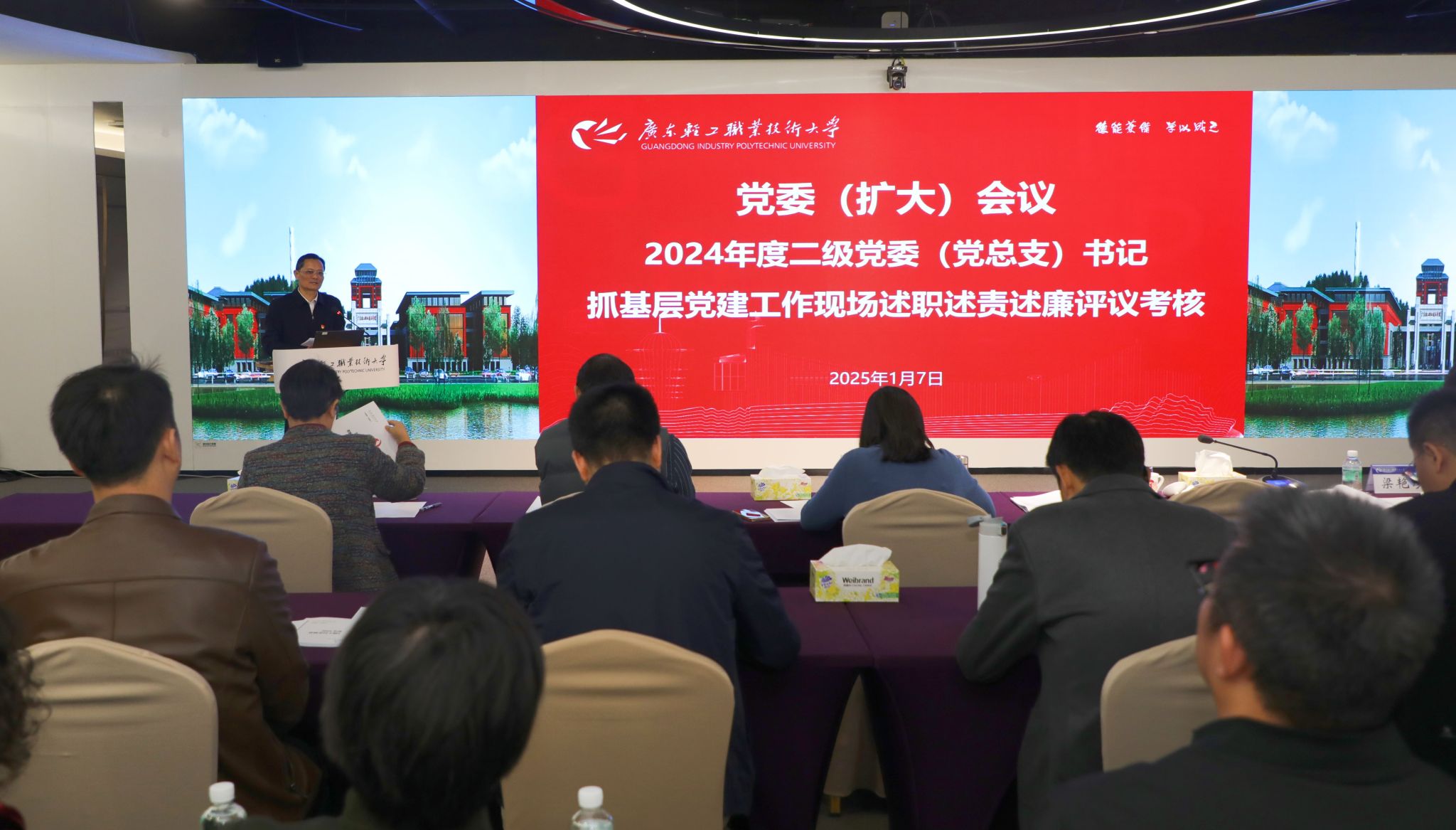 1月7日上午,学校在新港校区第二实训楼多功能展示中心以党委(扩大)会议的形式组织召开二级党委(党总支)书记现场述职述责述廉评议会议。学校党委书记杜安国在会上作总结点评,全体校领导出席会议,党委副书记梁艳珍主持。