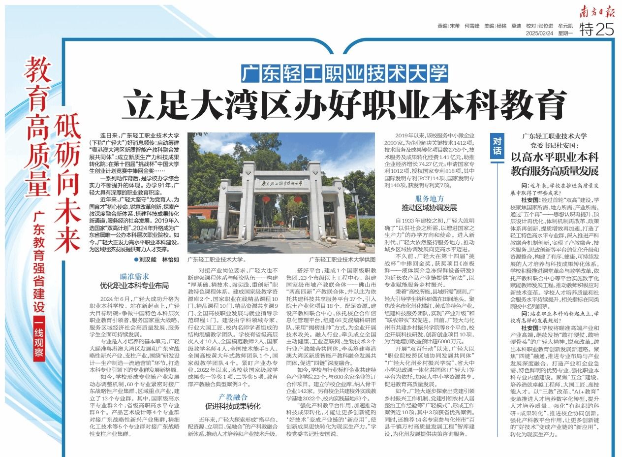 2月24日,全省教育大会在广州召开。《南方日报》在《教育高质量 砥砺向未来——广东教育强省建设一线观察》特刊中以《广东轻工职业技术大学:立足大湾区办好职业本科教育》为题,报道了学校近年来高质量发展的成效并专访了学校党委书记杜安国。现将全文转载如下: