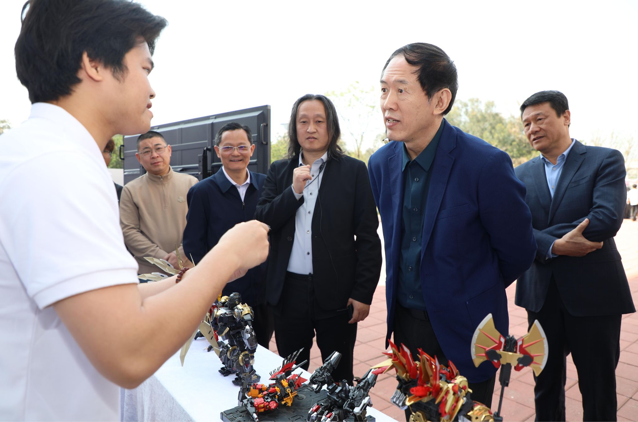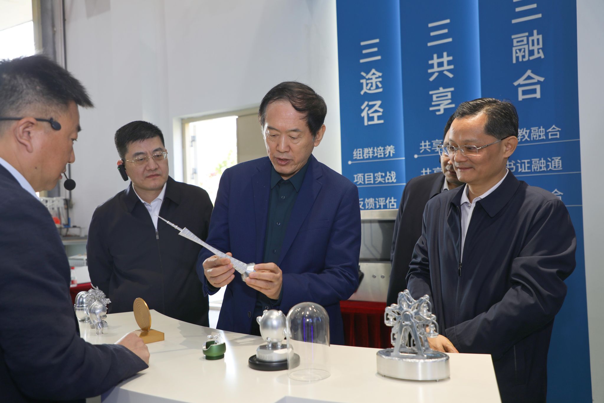 徐辉一行深入智能制造与装备学院实训基地、艺术设计学院专业风采展详细了解学校在技术创新、产教融合及人才培养方面的成果。徐辉询问了“π型人才”培养理念的内涵,参观了学生作品展区,与师生们交流了3D打印技术生产的解压玩具、音乐小青蛙等创意作品的打印成本、工艺难点、一体成型技术,了解了2025年中国国际大学生创新大赛我校参赛项目《高精二流体喷淋管革新PCB智造》和第十四届“挑战杯”秦创原中国大学生创业计划竞赛金奖项目《冻极鲜—液体媒介急冻保鲜设备研发》。在微实践中心,电气222班钟海少介绍了自主研发的“Profinet远程IO模块”,徐辉详细了解了项目研发所需课程知识、应用场景及合作企业,并评价“技术先进、市场前景广阔,年轻人大有可为”。