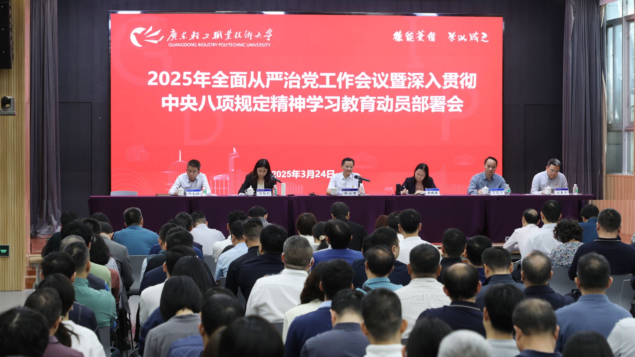 3月24日上午,学校在新港校区召开2025年全面从严治党工作会议暨深入贯彻中央八项规定精神学习教育动员部署会,深入学习贯彻习近平总书记在中央政治局集体学习时的重要讲话精神,关于深入贯彻中央八项规定精神学习教育的重要讲话和重要指示精神,落实教育部和广东省委有关会议精神,研究部署学校开展深入贯彻中央八项规定精神学习教育,总结过去一年学校全面从严治党工作,部署2025年重点任务。