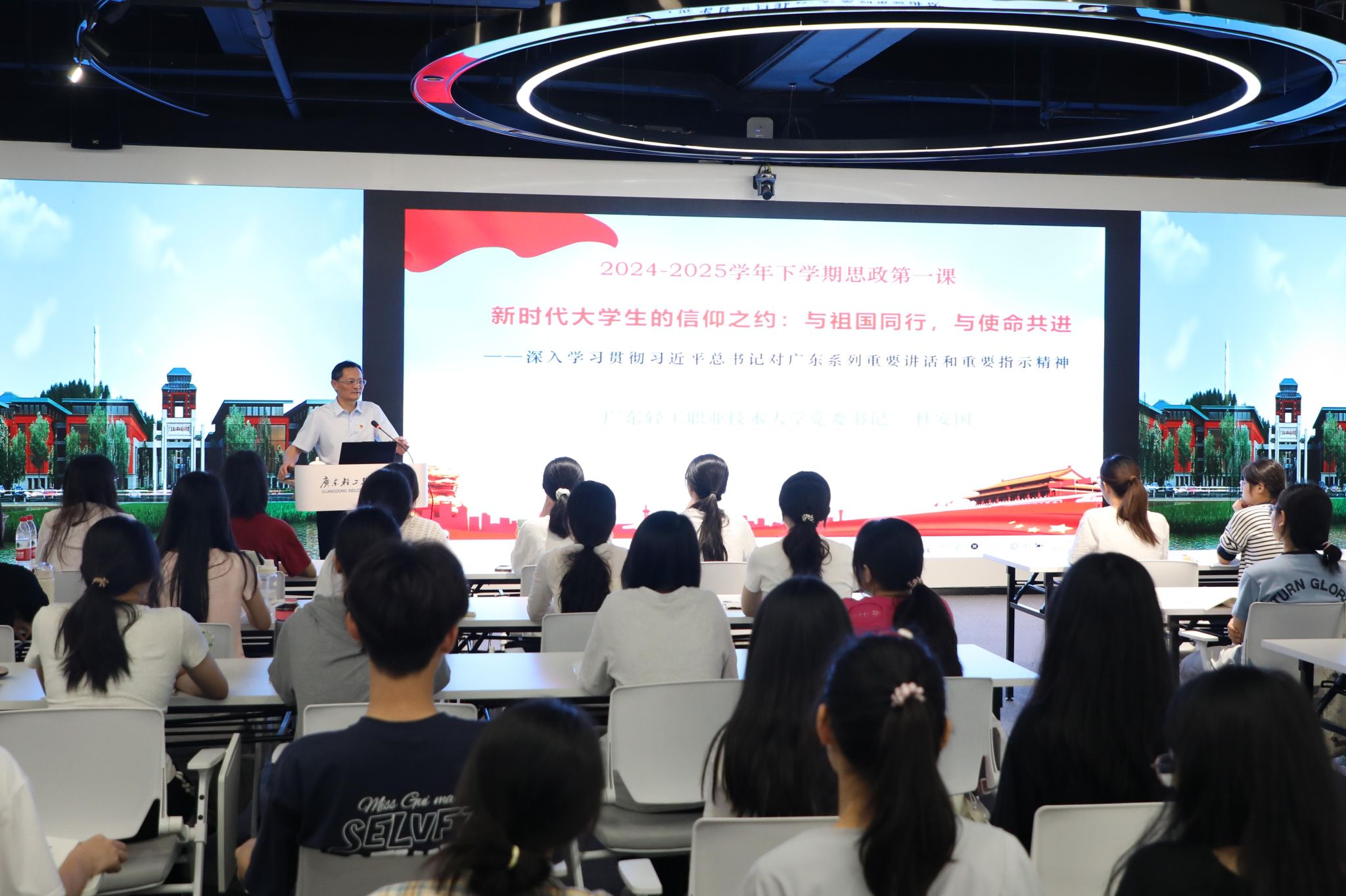 3月27日上午,学校党委书记杜安国在新港校区第二实训楼多功能展示中心,为商英245、应英245班的同学们讲授了一堂内容深刻、激励人心的思政课,主题为“新时代大学生的信仰之约:与祖国同行,与使命共进——深入学习贯彻习近平总书记对广东系列重要讲话和重要指示精神”。