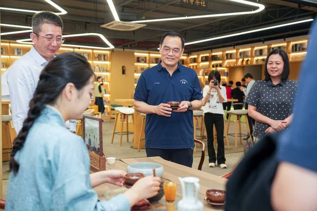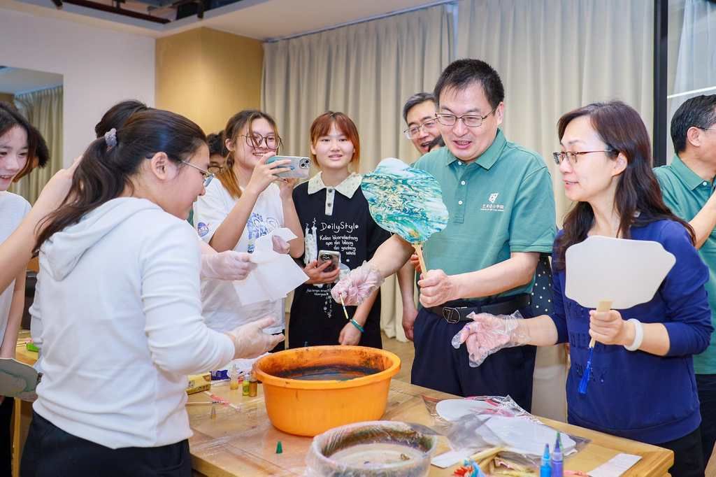 在大学生社区实践基地,参加活动的党员观看了设计作品展,浏览体验了剪纸、漆艺、点茶等非遗项目以及我校学生参与设计的智能车载座椅,了解了艺术设计学院数字创意时代非遗传承的职教新模式、“工学商一体化”人才培养模式、职业本科办学目标。
