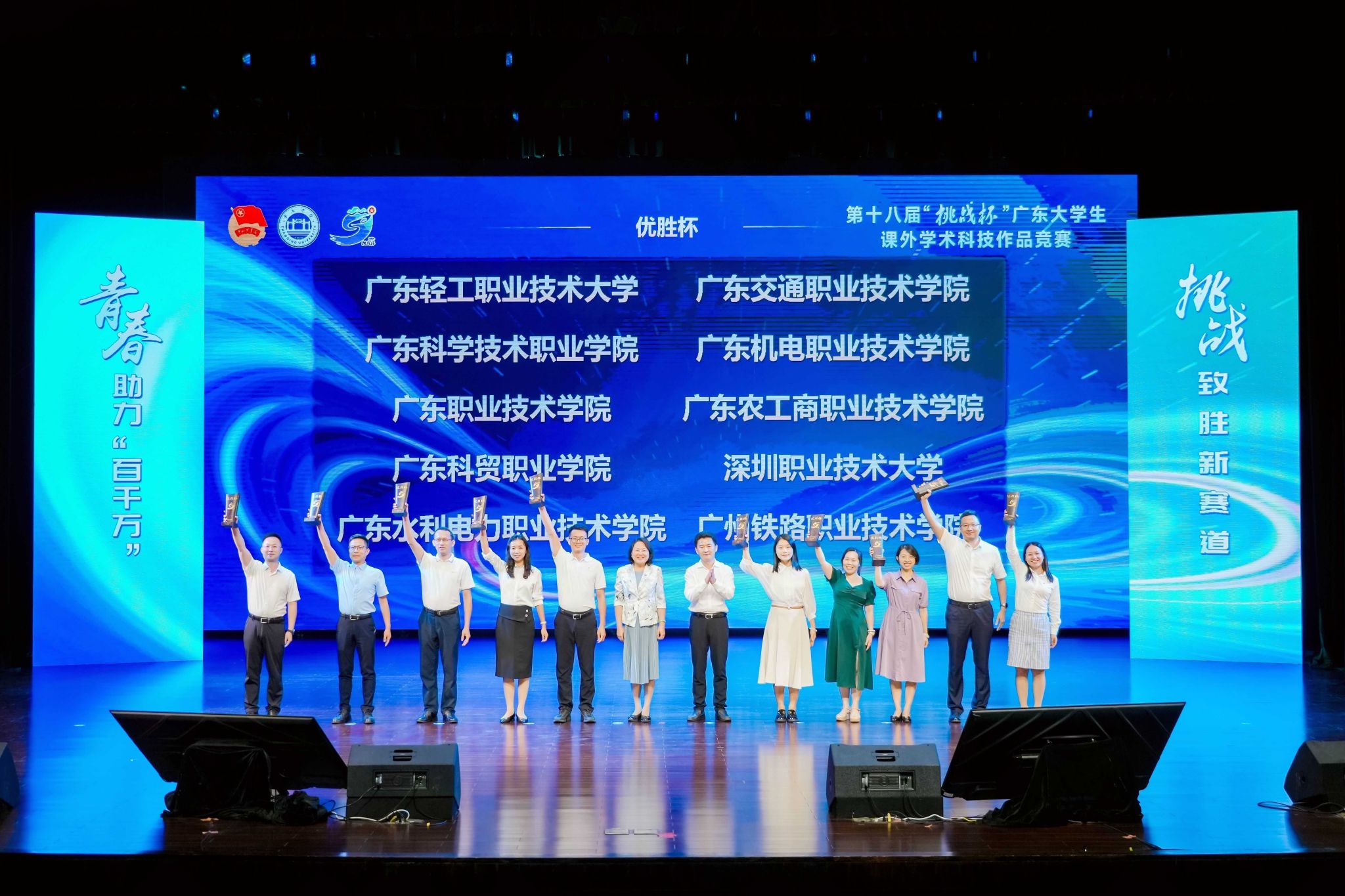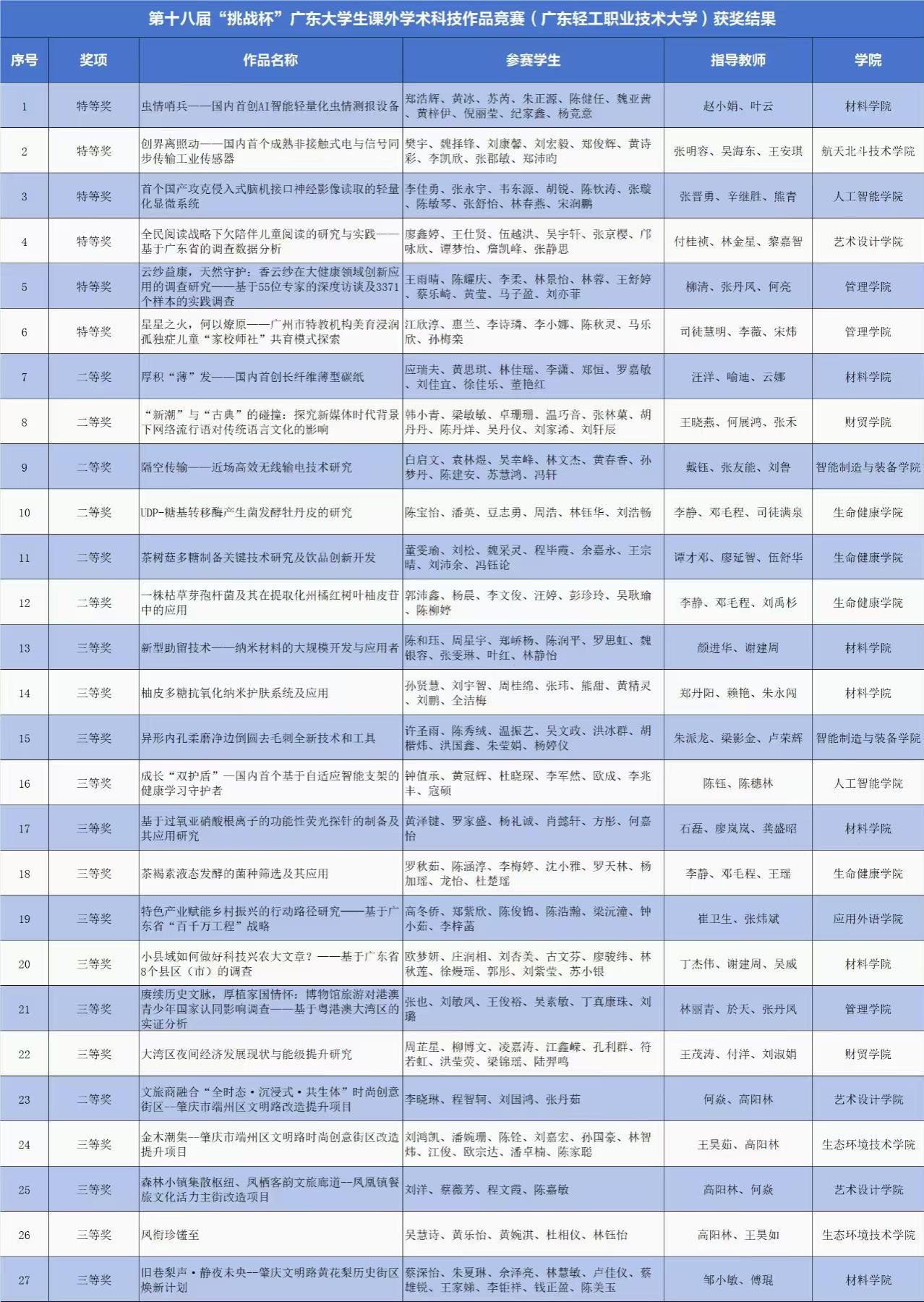 5月17日—19日,团省委、省教育厅、省科学技术厅、省科学技术协会、省社会科学院、肇庆市人民政府共同主办的第十八届“挑战杯”广东大学生课外学术科技作品竞赛终审决赛于肇庆顺利举办。学校的27项作品从全省161所院校的2074件参赛作品中脱颖而出,分别获得特等奖6项、二等奖7项、三等奖14项,获奖总数、特等奖获奖总数、团体总分均位居全省高职第一,获得优秀组织奖并实现连续七届蝉联“优胜杯”奖项。