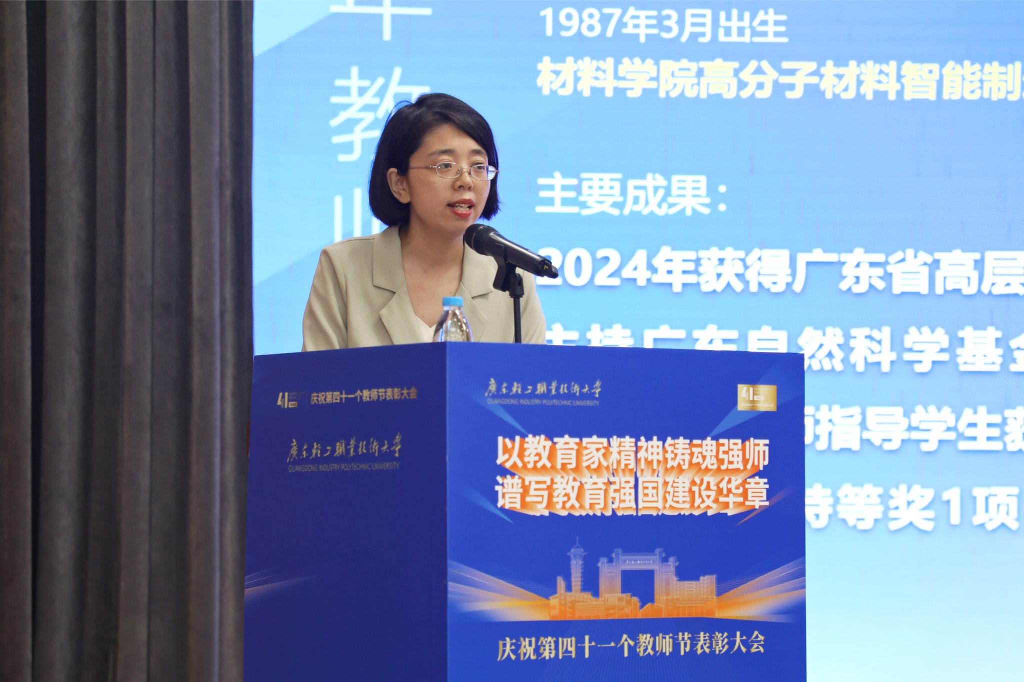 随后,优秀教师、学生代表在会上发言。广东省高层次人才、材料学院副教授李美表示,十年来,我连续八年担任高分子专业班主任,看着一批批学子从青涩到成熟。我始终坚信,职业教育的生命力在于与实践结合、与产业对接。因此,我积极带领学生投身科研项目,将课堂所学转化为解决实际问题的能力。我们的学生团队以项目成果为依托,先后获得了“互联网+”国赛金奖、“挑战杯”国赛特等奖。作为青年教师,我将继续坚守立德树人初心,以培养更多高素质技术技能人才、能工巧匠为己任,将个人发展融入学校高质量发展,为探索中国特色的职业教育发展之路贡献自己的绵薄之力!