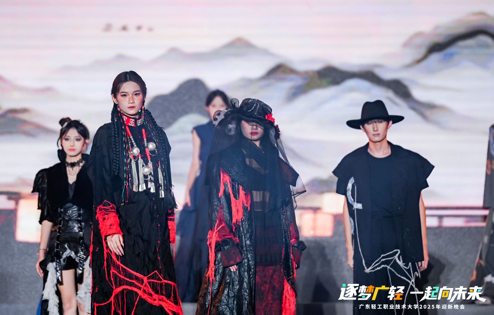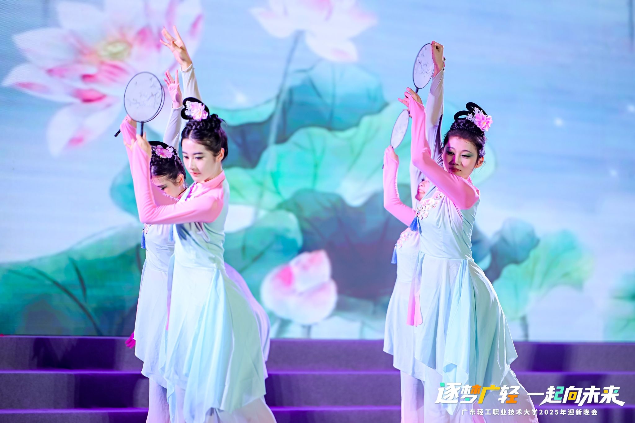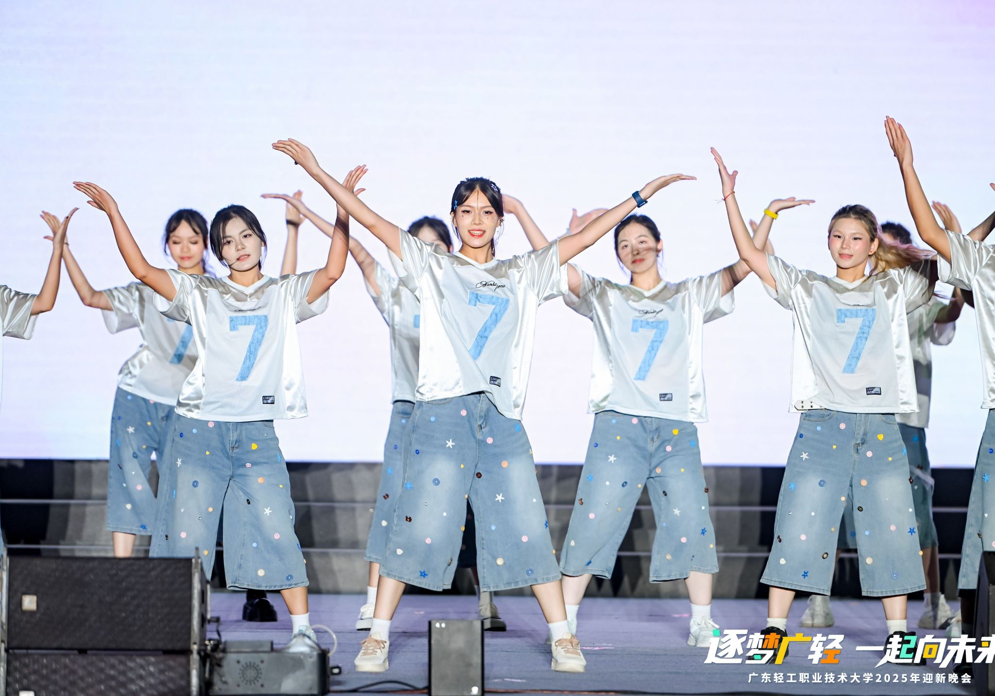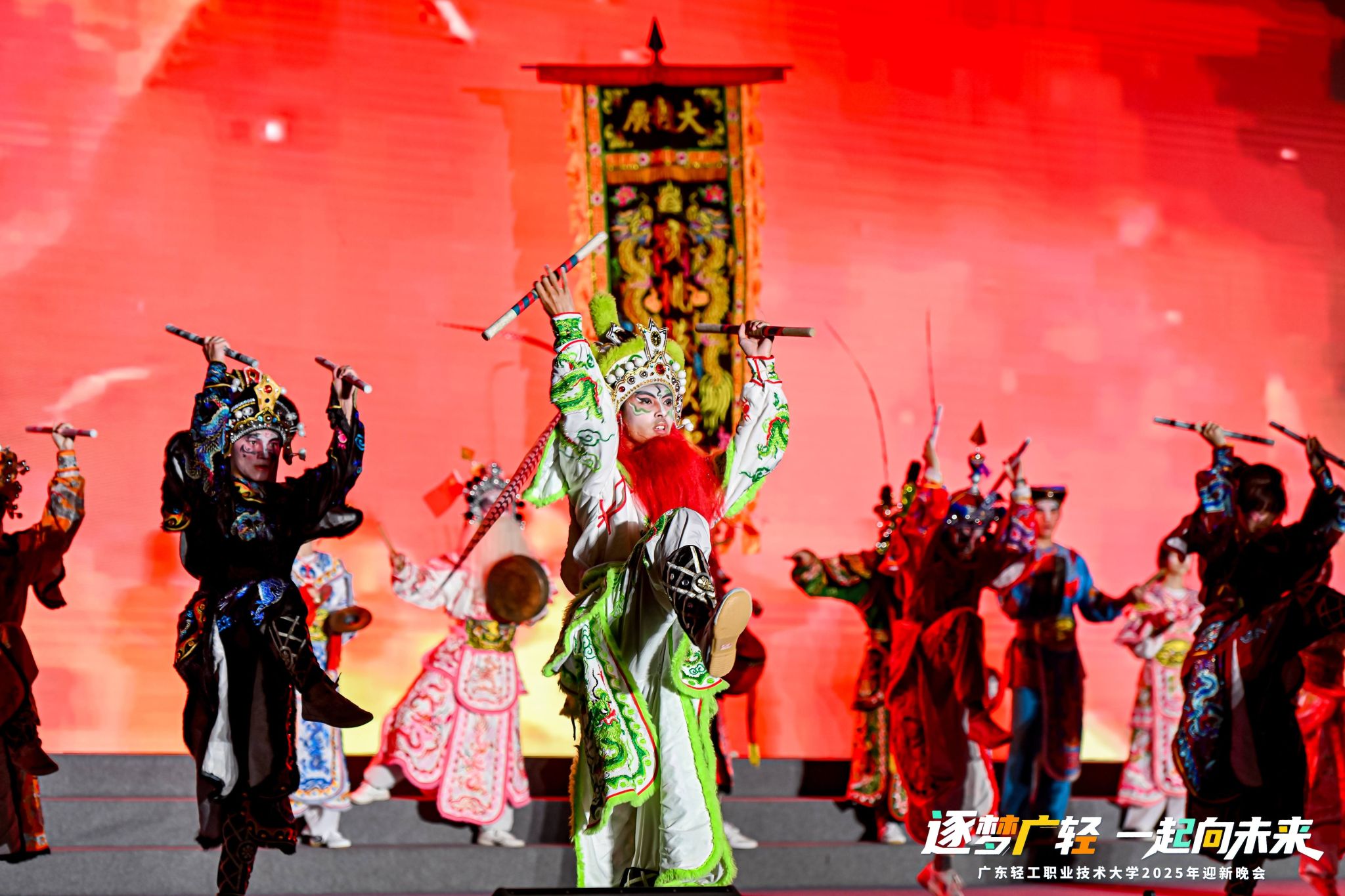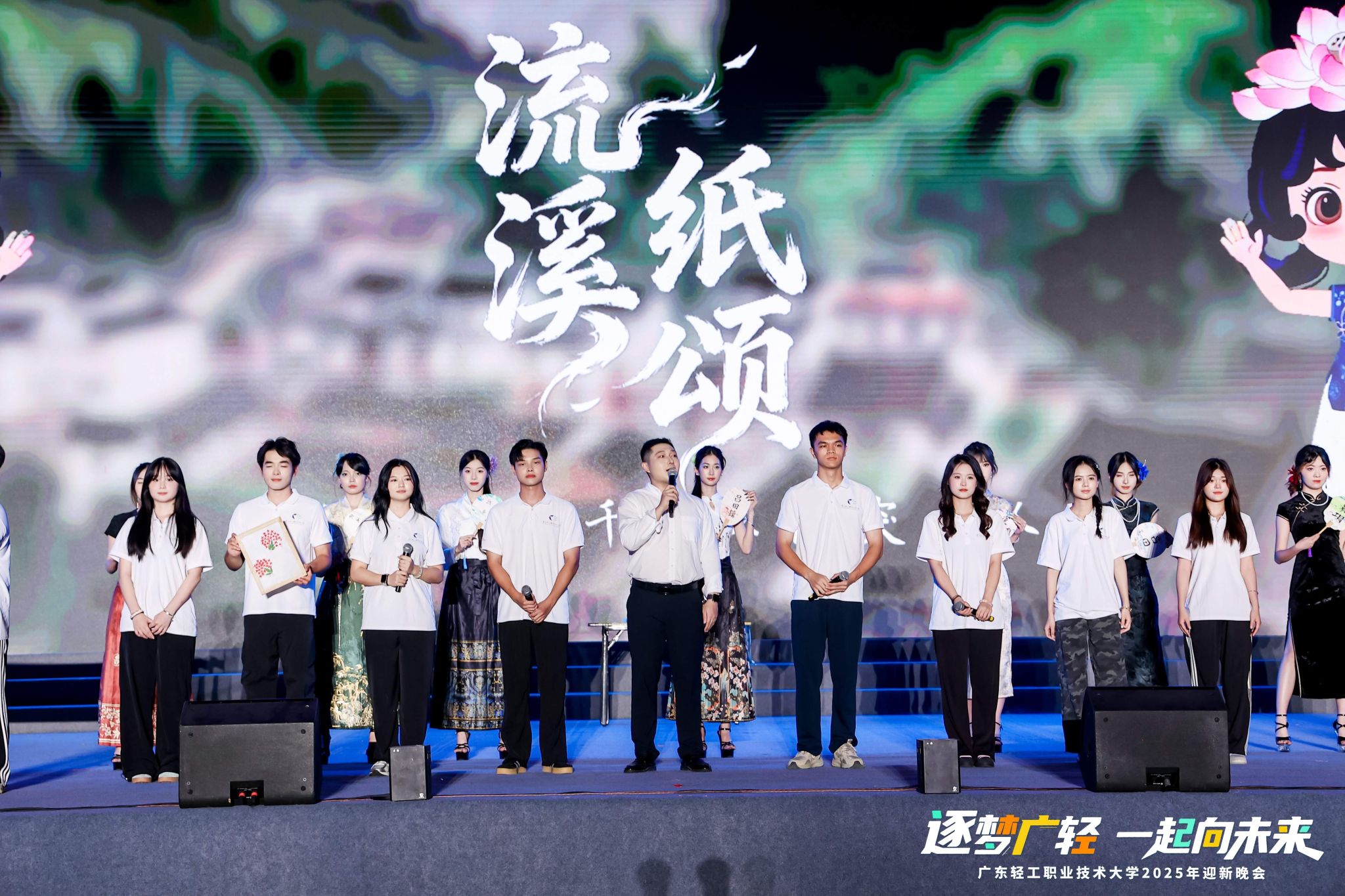 晚会分为“寻梦・叩响未来之门”“追梦・谱写青春华章”“圆梦・奔赴星辰大海”三个篇章,在宝桃英歌舞队表演《巳巳如意》中拉开帷幕,激昂的锣鼓声与多变的步伐,不仅展现了中华优秀传统文化的独特魅力,更彰显出广轻学子逐梦前行的昂扬斗志。随着晚会的有序推进,一系列精彩纷呈的节目依次上演,涵盖歌曲联唱《你好,新同学》、学生舞蹈《淡妆浓抹总相宜》、辅导员朗诵《写给未来的你》,每个节目均洋溢着青春的活力与对未来的美好期许。社会实践风采展《流溪纸颂》、优秀毕业设计展《界破》,讲述了广轻青年专业学习和实践运用紧密结合的青春故事。教职工舞蹈《我的祖国》、学生朗诵《乡音里的中国,青春里的我们》满怀对祖国深沉的热爱,献礼新中国成立76周年。