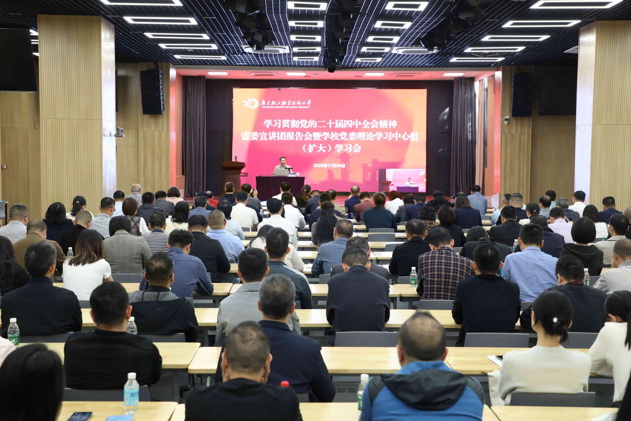 11月24日,学习贯彻党的二十届四中全会精神省委宣讲团宣讲报告会暨学校党委理论学习中心组(扩大)学习会在我校举行。会议分别在新港校区、南海校区北区设立主会场和分会场,省委宣讲团成员,中山大学区域开放与合作研究院院长、港澳珠江三角洲研究中心教授、博士生导师毛艳华来校宣讲。校领导班子出席会议。