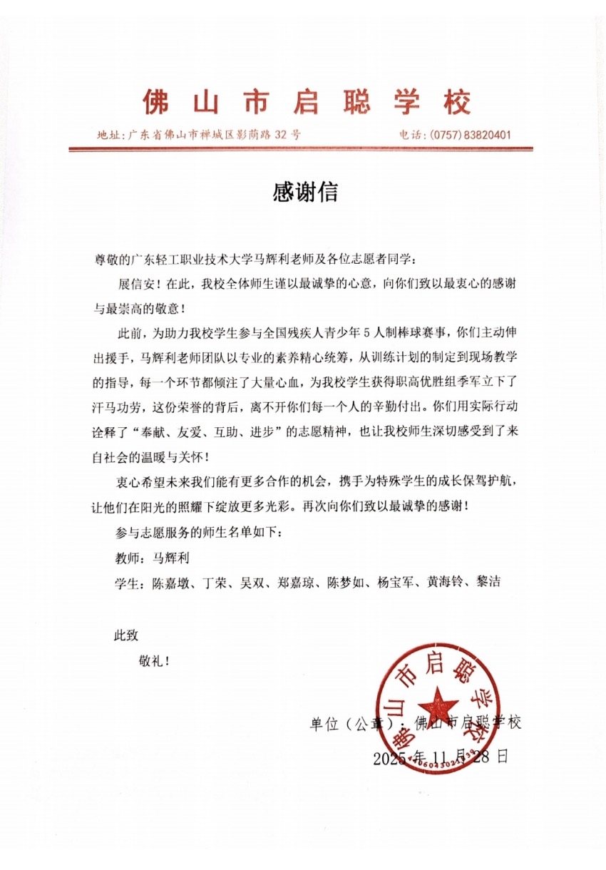 11月,佛山市启聪学校在全国残疾青少年五人制棒球锦标赛中斩获第三名。近日,该校为马老师和队员们发来了感谢信。这份荣誉来之不易,它的背后,是校棒垒球队的倾心助力和无私奉献,也是小队员们一同默默付出的成果。棒垒球队的师生们说,球队自组建以来,就用行动践行着 “德能兼备,学以成之” 的校训。未来,球队将继续秉持着卓越的体育精神与深厚的人文关怀,力争在省级赛事中创佳绩,同时也将通过公益活动,继续把热爱运动的种子播撒在特殊教育的沃土上。(图文:体育部)