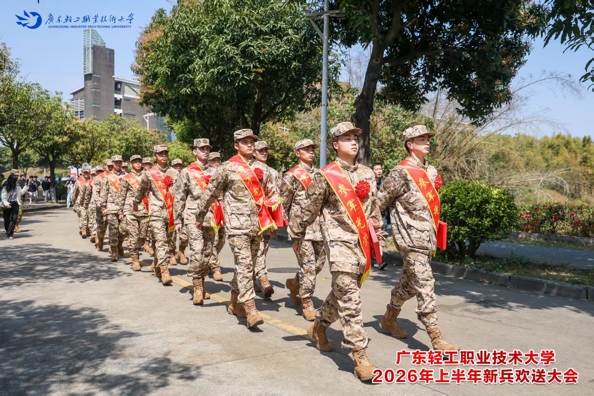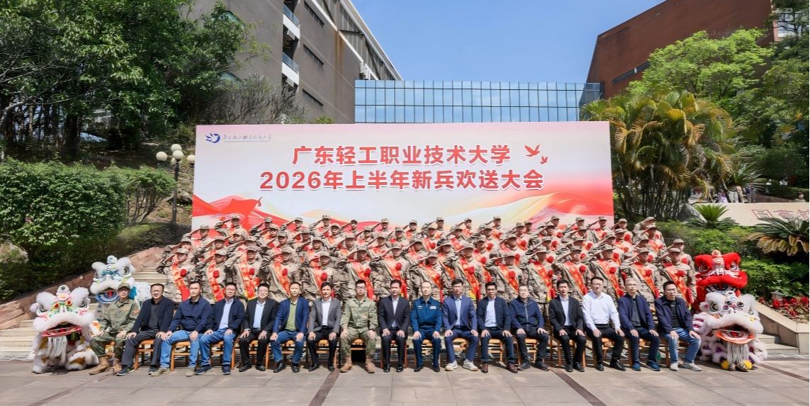 3月14日上午,我校在南海校区图书馆报告厅举行2026年上半年新兵欢送大会,欢送62名学子光荣入伍。学校党委副书记廖志成,广州市海珠区人民武装部政委程钢,佛山市南海区人民武装部军事参谋莫国永出席大会。