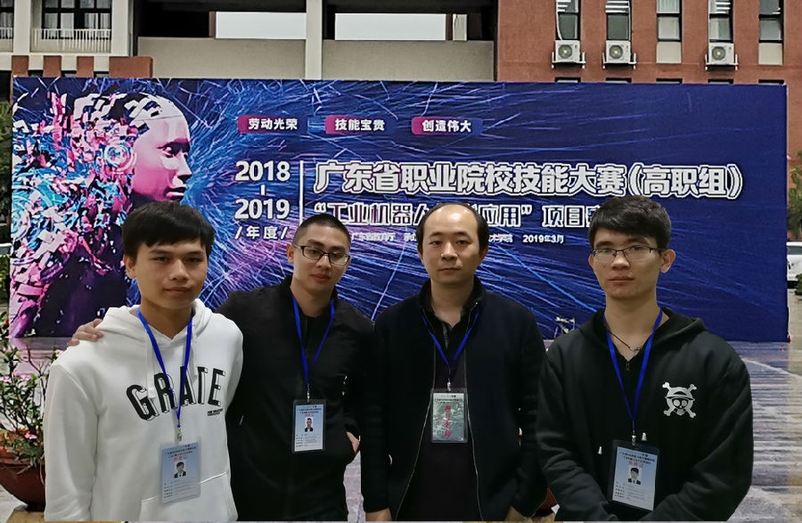 3月7日至9日,在2018—2019 年度广东省职业院校学生专业技能大赛“工业机器人技术应用”赛项中,由我校机电技术学院工控161班梁桦杰、刘付仕兴、梁欢高三位同学组成的参赛队伍经过激烈角逐,成绩排名第三,荣获一等奖,并成功入选2018-2019年“工业机器人技术应用”赛项国赛集训队,毛诗柱和苑振国担任指导老师,赵荣担任领队。