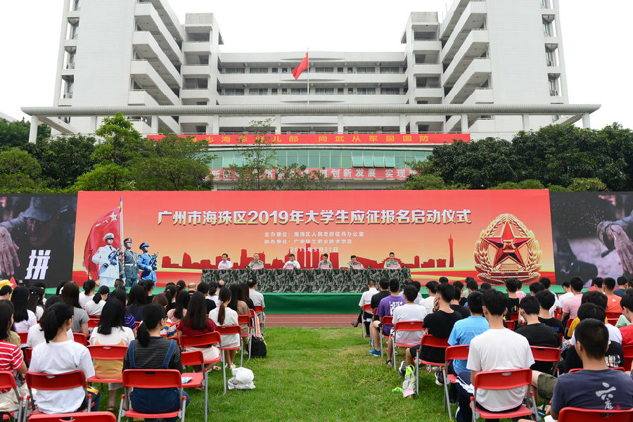5月21日下午,由广州市海珠区人民政府征兵办公室主办、我校承办的广州市海珠区2019年大学生应征报名启动仪式在广州校区大操场举行。海珠区副区长陈建彬、海珠区人武部政委聂东风、海珠区人武部部长王小明,学校党委副书记朱其祥出席仪式。