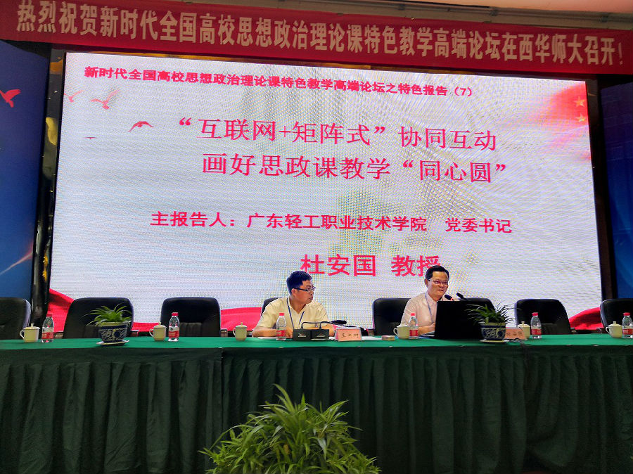 7月12-14日,新时代全国高校思想政治理论课特色教学高端论坛在四川南充召开,全国160多名高校思政课学者参加论坛,14所高校(含2所高职)思政专家受邀作思政课教改特色报告。学校党委书记杜安国在论坛特色报告中介绍了我校“互联网+矩阵式”协同互动思政课教育教学改革经验。
