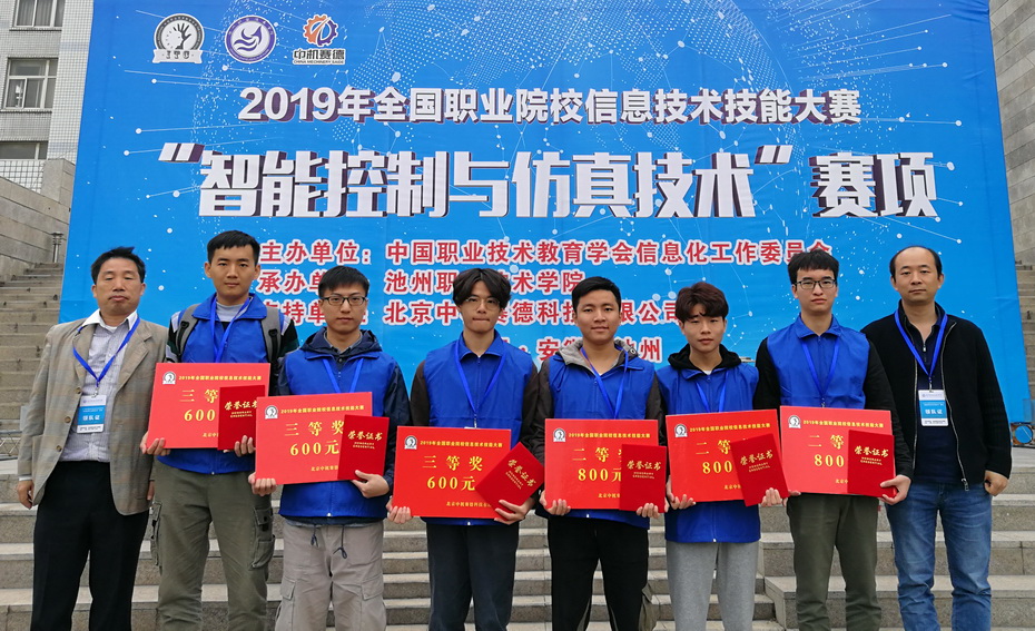 10月25至27日, 2019年全国职业院校信息技术技能大赛-智能控制与仿真技术赛项在安徽举行。经过紧张激烈的角逐,我校机电技术学院工业机器人技术专业的郑厚才、黄培豪和黄智汉等同学组成的一队获得二等奖,指导老师是毛诗柱和苑振国,纪俊涛、梁嘉源和巫俊杰等同学组成的二队获得三等奖,指导老师是颜学定和杜亮。