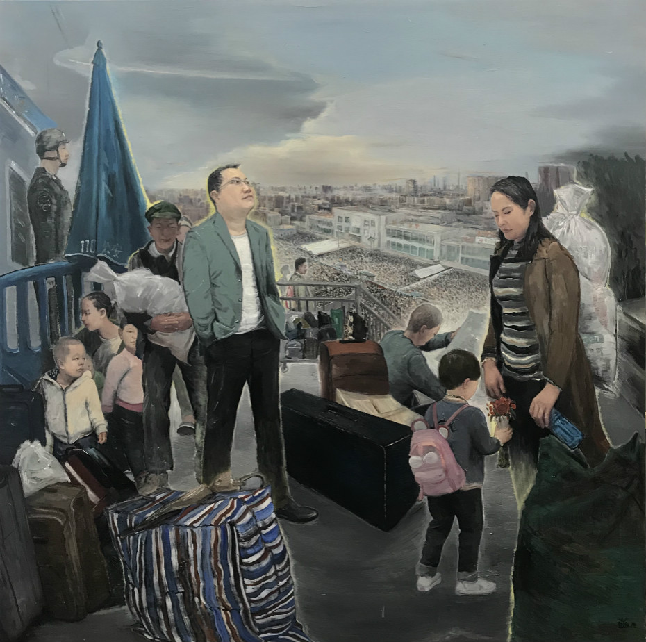 杨国强多年来始终坚持以人民为中心的创作导向,“不忘初心、牢记使命”,努力把自己锻造成一位政治素质过硬、专业知识扎实的艺术工作者。从身边之事中践行“初心与使命”是杨国强一直秉持的创作理念。他回忆道:在国家青苗艺术培育计划杰青班期间,我有幸聆听广州美术学院李劲堃院长为学员们所作的讲座——“你关注社会,社会就关注你”,这对我后来的创作实践起到了巨大指导作用。比如:为庆祝改革开放40周年,2018年杨国强创作的油画作品《回家》,就是以广州火车站作为创作蓝本,春节务工人员回家过新年的场景为创作背景,表现了绿皮火车时代向高铁动车时代转变的历史性伟大奇迹。该作品入选由中国美术家协会、中共广东省委宣传部、广东省文学艺术届联合会共同举办的“潮起珠江”——庆祝改革开放40周年全国美术作品展。
