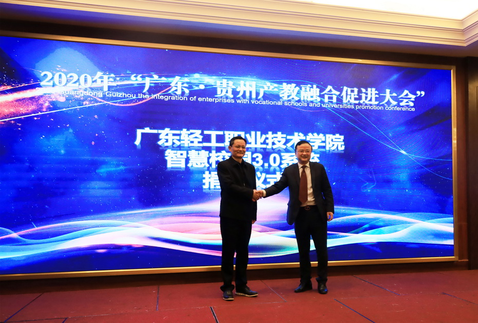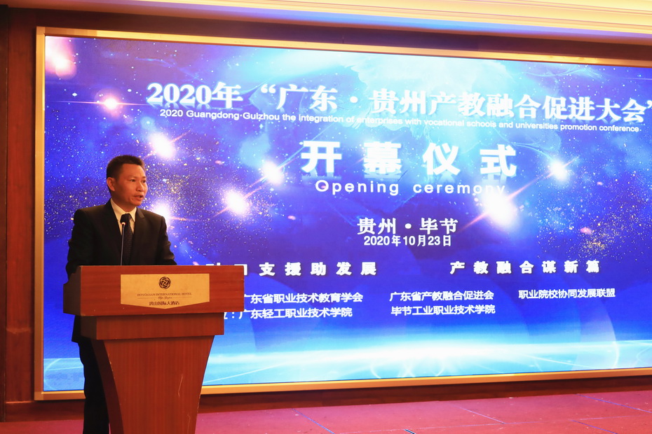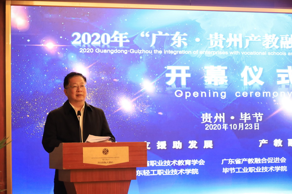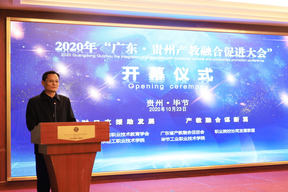 10月23日,在贵州省毕节市召开由广东省职业技术教育学会、广东省产教融合促进会、职业院校对口支援协同发展联盟主办,我校和毕节工业职业技术学院共同承办,主题为“职教帮扶促发展,产教融合谋新篇”的2020年“广东-贵州产教融合促进大会”。广东省教育厅二级巡视员朱俊文,贵州省教育厅一级巡视员鞠洪,毕节市委常委、副市长胡爱斌,广东省教育厅职终处处长吴艳玲,广东省教育厅政务中心主任梅毅,广东省职业技术教育学会会长、我校党委书记杜安国等广东省教育厅、广州市教育局,贵州省教育厅,毕节市教育局相关负责人及参与产教融合发展的60家企业和来自贵州省的41所中高职院校、广东省的7所高职院校负责人参加活动。毕节工业职业技术学院党委副书记、院长邱国援主持会议。会上成功签约2项捐赠,5项校校合作帮扶协议,33项校企产教融合意向项目。