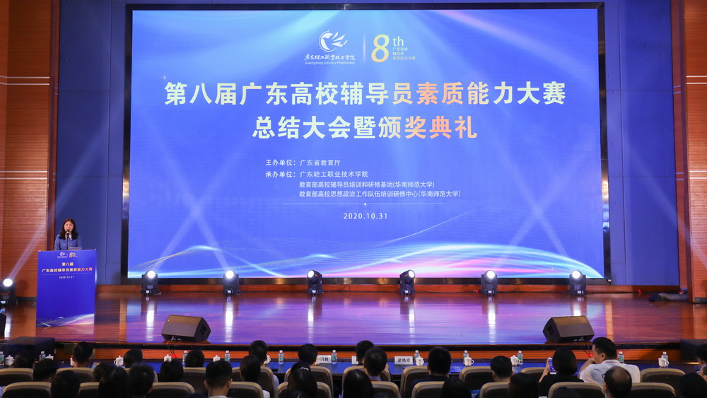 10月31日,由广东省教育厅主办,广东轻工职业技术学院、教育部高校思想政治工作队伍培训研修中心(华南师范大学)、教育部高校辅导员培训和研修基地(华南师范大学)承办的第八届广东高校辅导员素质能力大赛在我校举行。广东省教育厅思想政治工作与宣传处副处长陈琦、我校党委副书记梁艳珍、教育部高校辅导员培训和研修基地(华南师范大学)常务副主任魏则胜出席。当晚,大赛举行总结大会暨颁奖典礼,我校参赛辅导员荣获一等奖。