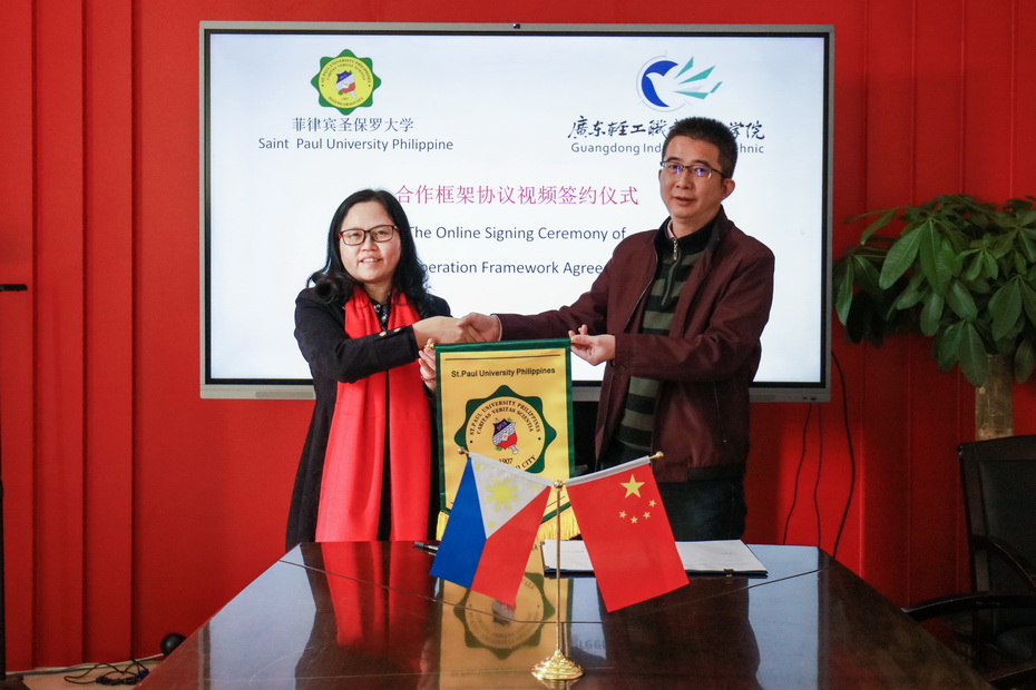12月22日上午,我校在广州校区办公楼二楼会议室举行了与菲律宾圣保罗大学教育合作框架协议签约仪式。仪式通过线上线下同时进行,菲律宾圣保罗大学校长梅塞德塔斯•安、副校长安格雷皮娜•玛丽白博士、国际关际部主任杰瑞米•莫拉莱斯博士、中国学生服务中心主任文斯•罗永明博士、中国学生服务中心副主任霏丝•柯晓颖博士、我校副校长邓毛程等出席。