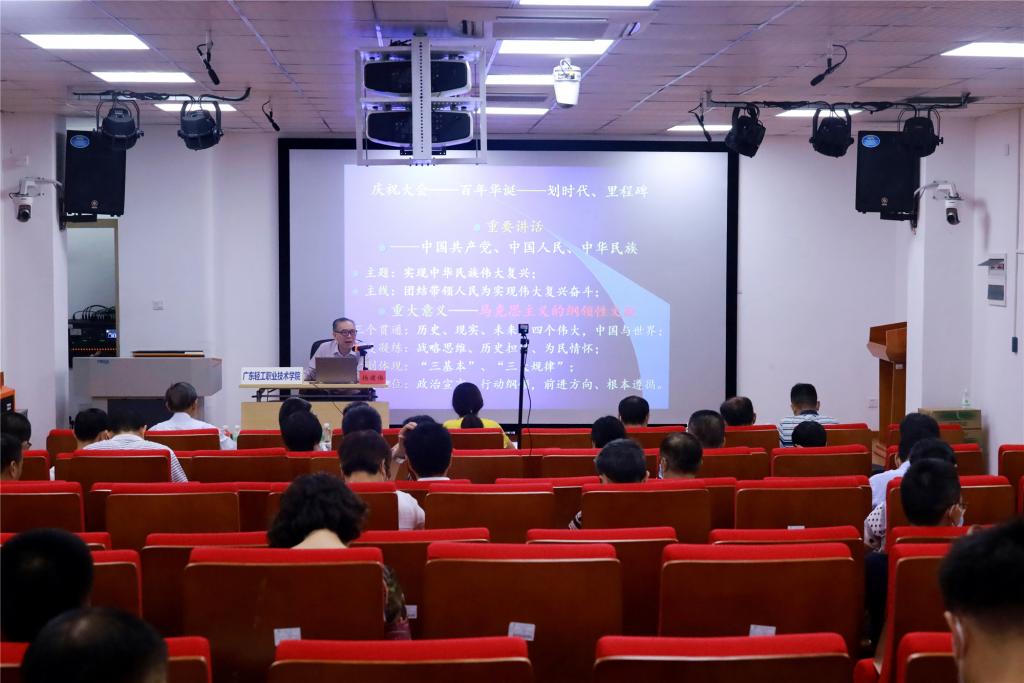 为深入学习贯彻习近平总书记“七一”重要讲话精神,切实做好“七一”重要讲话精神的学习、宣传、研究、阐释,持续推进党史学习教育走深走实。8月13日上午,我校在第一实训楼105举行党史学习教育专题宣讲暨党委理论学习中心组(扩大)学习会,省委党史研究室主任、省委党史学习教育领导小组成员、习近平总书记“七一”重要讲话精神省委宣讲团成员杨建伟教授应邀作了题为《回顾百年奋斗光辉历程 展望伟大复兴光明前景——深入学习习近平总书记“七一”重要讲话精神》的学习宣讲。广东省委教育工委党史学习教育指导组成员在线上进行指导,学校党委委员、领导干部和党员教师600余人线上线下参加了学习,宣讲会由学校党委副书记、纪委书记朱其祥主持。