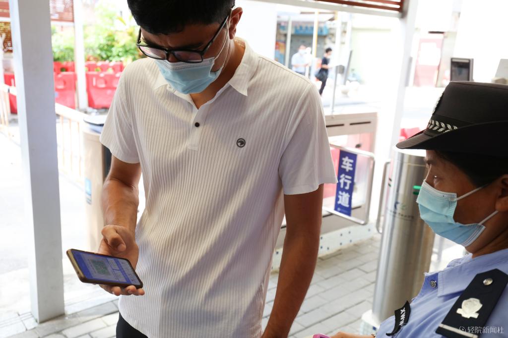 演练开始,准备入校的“同学”们按要求排好队,佩戴好口罩,有秩序地通过人脸识别门禁,门卫工作人员对其进行测温,并检查粤康码。绿码、体温正常、无其他症状者,方可进入校内。