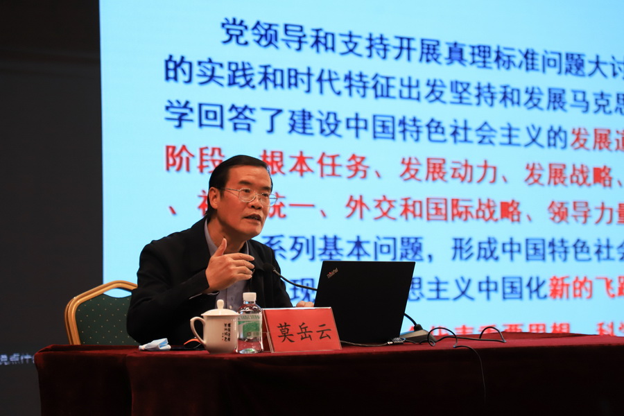 莫岳云教授以“百年党史重大成就和历史经验的科学总结”为题,从党的十九届六中全会主要内容概述、百年奋斗取得的四个伟大成就、百年探索取得的十大历史经验和十九届六中全会的历史地位等4个方面深入解读了十九届六中全会精神和《决议》重要内容。