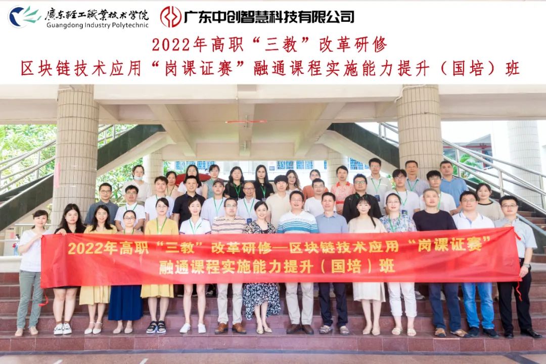 7月24-30日,由学校和广东中创智慧科技有限公司联合承办的“2022年“三教”改革研修——区块链技术应用“岗课证赛”融通课程实施能力提升(国培)班”顺利在我校举办,来自全省24所高职院校的40位骨干教师参加为期7天的培训,本次培训主要采取线下集中面授、企业考察观摩、线上实操等形式。