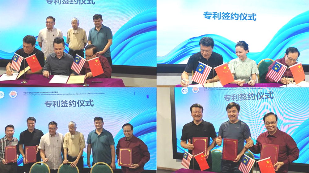 100余套参展作品涵盖家居生活用品、首饰、皮具、漆艺、插画、服装与服饰等多个类别,全部来自于我校艺术设计学院“工学商一体化”项目制课程的教学成果。3天展览期间,来自世界各地的观展者络绎不绝,个性鲜明富有创意的“工学商一体化”文创作品也吸引了马来西亚企业家。在马来西亚中国公共关系协会副会长拿督威拉颜天禄、国际郑和研究院陈达生博士和周安兵董事的见证下,马来西亚龙马进出口公司(LongMa Import & Export Sdn Bhd)、南洋草药有限公司(Nan Yang Herbs Sdn Bhd)、马中全球教育咨询公司(MC Global Eduinfo Sdn Bhd)、博灵公司(Boling Realty Sdn Bhd)的代表、国际郑和研究院代表和我校代表一同签署了“郑和纸雕灯”“双面拼图”“撑花伞”“郑和IP”等10件套海丝文创作品的独家知识产权授权使用协议。
