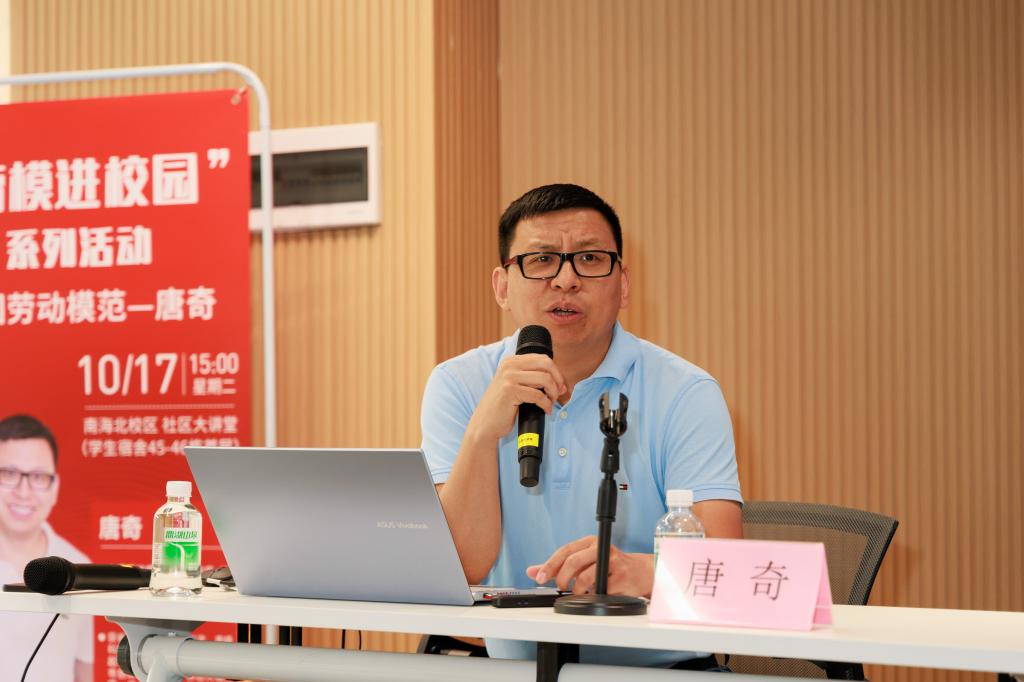 为落实立德树人根本任务,把社会的优质资源引入校园,实现思政小课堂与社会大课堂的有效结合。学校党委社区思政管理委员会组织开展大国工匠、劳模进校园系列活动。10月17日下午,全国劳动模范唐奇在我校南海校区社区思政基地讲授了主题为“工匠精神与学习”的讲座,约220名学生报名参加,学校副校长梅建波出席。