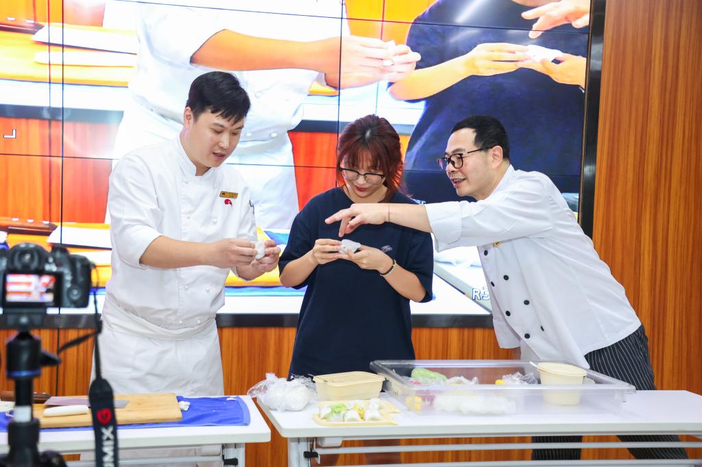 谭广燐大师(右一)现场示范包虾饺